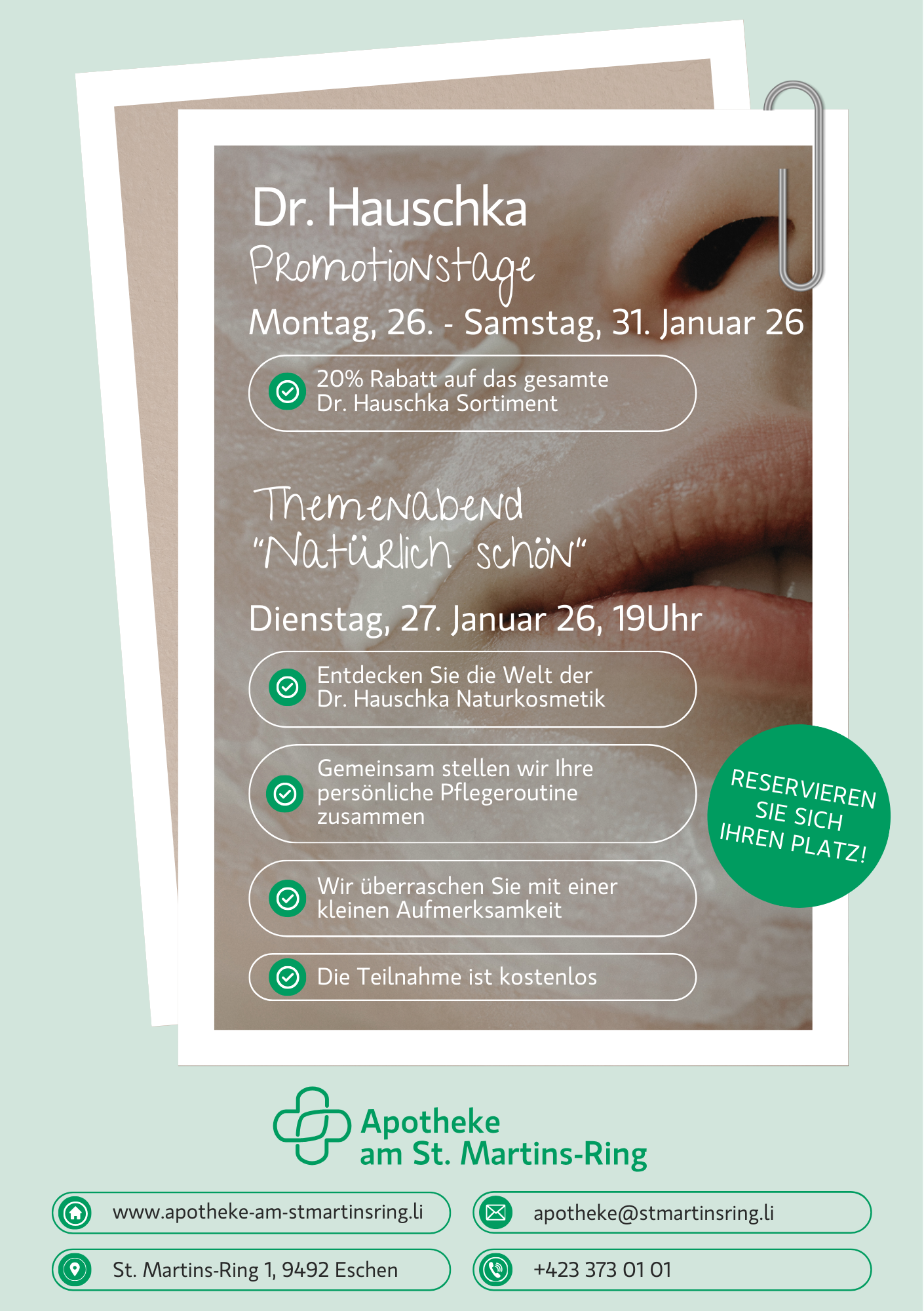 Dr. Hauschka PromotionstageMontag, 26. – Samstag, 31. Januar 26 Themenabend “Natürlich schön” Dienstag, 27. Januar 26, 19Uhr Entdecken Sie die Welt der Dr. Hauschka Naturkosmetik Reservieren Sie sich Ihren Platz!